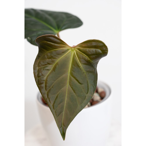 Liście anthurium są zazwyczaj błyszczące, zielone i sercowate, ale kształt liści może nieco się różnić w zależności od gatunku. Te najbardziej pożądane to jednak te zamszowe, półmatowe, o ciekawych fakturach czy kolorze unerwienia.