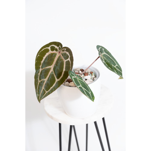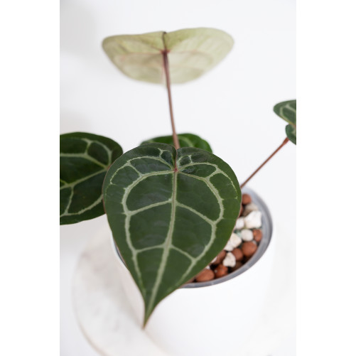 Anthurium besseae aff. (sekcja: Cardiolonchium) to jedna z najciekawszych roślin kolekcjonerskich w świecie anturiów. Ta forma, często oznaczana jako „aff.” (czyli affinis = „podobna do”), nie została jeszcze oficjalnie sklasyfikowana jako osobny gatunek. Liście owalne do sercowatych, często z lekko zaokrągloną nasadą. Kolor: głęboko ciemnozielony lub butelkowozielony, z srebrzystym unerwieniem – bardziej „rozmytym” niż u klasycznego crystallinum. Bardzo aksamitna faktura, niemal jedwabista – przypomina dressleri lub crystallinum dark form. Młode liście bywają lekko brązowawe, potem intensywnieją. Rozmiar: zazwyczaj średni (20–40 cm), ale w idealnych warunkach potrafią być większe. Pochodzenie: Ameryka Środkowa (głównie Panama, Kolumbia, Kostaryka), dżungle o bardzo wysokiej wilgotności.