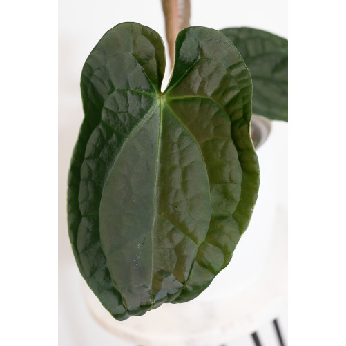 Anthurium forgetii (sekcja: Cardiolonchium ): to jedna z najbardziej rozpoznawalnych roślin kolekcjonerskich. Wyróżnia się charakterystycznym, pełnym, owalnym kształtem liścia bez zatoki (sinus), co nadaje mu niezwykle elegancki i minimalistyczny wygląd. Aksamitna tekstura liścia – przy odpowiednim świetle liście pięknie połyskują. Kolor: od ciemnozielonego po prawie czarny, często z kontrastowymi białymi lub srebrnymi nerwami. Młode liście często są jasnozielone z fioletowym refleksem, a starsze ciemnieją. Liście osiągają zazwyczaj 15–30 cm długości, ale większe okazy mogą dorastać do 40 cm. Charakterystyczne formy to White Stripes (wyrażne, jasne, brokatowe unerwienie) lub Dark Form – bardzo ciemne z cienkim, ciemnozielonym unerwieniem. Liście rosną w rozetę – bardzo estetyczny układ.